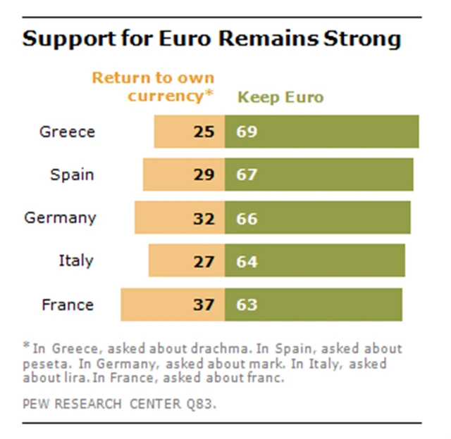 Nedávný průzkum evropského veřejného mínění Pew Research Center ukazuje, že krize finančního systému a zaměstnanosti ohrožuje evropskou integraci. Přesto se ale žádná z členských zemí nechce vrátit ke své původní měně. Zajímavý pohled nabízí Pew také na evropské stereotypy.