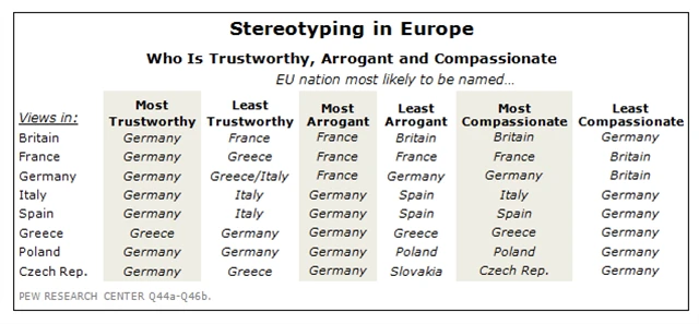 Na závěr malé odlehčení, ať nekončíme tak pesimisticky: Evropské stereotypy podle výsledků průzkumu Pew. Obrázek si udělejte sami.