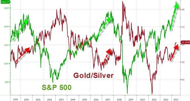 Obecně, když rostou ceny akcií a zužují se kreditní spready, poměr cen zlata a stříbra klesá, protože na trzích převažuje dobrá nálada a důvěra v oživení ekonomiky. Dvakrát v posledních letech toto "pravidlo" přestalo platit a v obou případech následoval pokles cen akcií. Vždy stačil růst poměru zlato/stříbro nad 50 při současném růstu cen akcií.