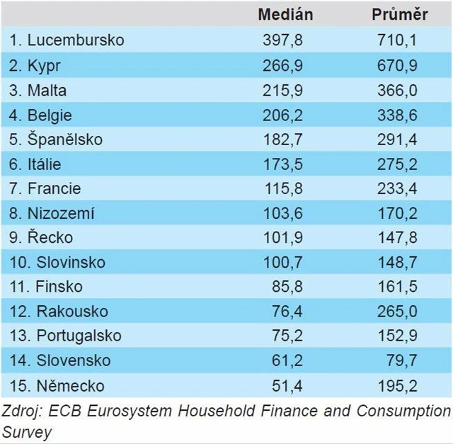 Dále můžeme úspěšně polemizovat i s výsledkem mediánové domácnosti (německá na posledním místě) a průměrné domácnosti (německá uprostřed žebříčku). Z poměru průměru a mediánu vyplývá poměrně vysoká nerovnost majetku v německých domácnostech.