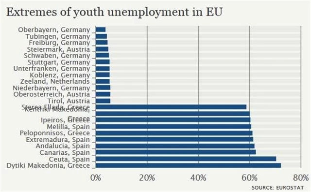 Zatímco skutečnost, že se řecká nezaměstnanost stále zvyšuje, už nikoho nepřekvapuje, vážným problémem je nezaměstnanost mladých. V některých oblastech Řecka dosáhla míra nezaměstnanosti lidí do 25 let neuvěřitelných 75 %. V celém Řecku byla loni 55,3 %, tedy na dvojnásobku evropského průměru 22,9 %.