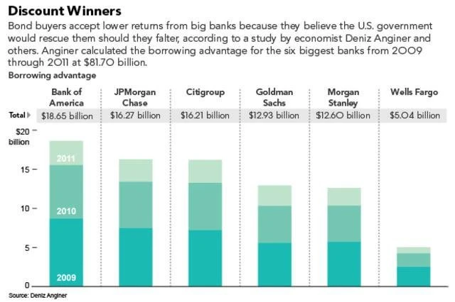 "Největší banky si na trhu půjčují levněji jen díky podpoře Fedu," pokračuje Ivry. "V roce 2009, kdy národní ekonomiky silně cítily důsledky ekonomické krize, ušetřila americká 'šestka' na vydaných dluhopisech celkem 37 miliard USD. Následující rok se jednalo o 30 miliard USD a v roce 2011 o 14,6 miliardy USD," vysvětluje Ivry. Ani snahy bankovních regulátorů, aby banky snižovaly své zadlužení, ani Dodd-Frank Act z roku 2010, který měl jednou provždy skoncovat s označením Too Big to Fail, tak zřejmě příliš změn nepřinesly. Ekonom Světové banky Deniz Anginer navíc spočítal, že si vybrané americké banky levněji půjčují již téměř dvacet let.