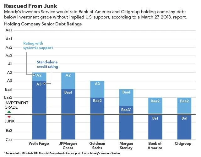 Podle ratingové agentury Moody's posunuje vysoká pravděpodobnost případného bailoutu americké "superšestky" ze strany vlády ratingové hodnocení bank o jeden až dva stupně výše. Bez předpokládané podpory Fedu a vlády by se rating Bank of America a Citigroup nacházel ve spekulativním pásmu junk.