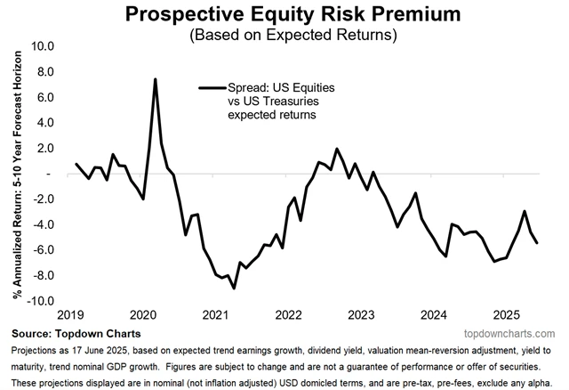 Jednou z komplikací pro investory je to, že i když se výnosy dluhopisů "jen" posouvají do strany, očekávaná riziková prémie amerických akcií je záporná. To znamená, že investoři na akciovém trhu buď o riziku, které podstupují, nevědí, nebo je ignorují, případně se plně soustředí na příběh silného hospodářského růstu a indikátorům naznačujícím jiné možnosti prostě nevěří.