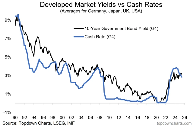 Krátkodobé úrokové sazby sice klesají, ale dluhopisový trh na to příliš nehledí. Výnosy dluhopisů se pohybují do strany, protože trh neztrácí naději, že globální ekonomika si povede dobře. Vzhledem k tomu, že současné uvolňování měnových politik centrálních bank není reakcí na hrozbu recese, ale na normalizaci inflace, platí, že čím výrazněji sazby centrálních bank klesnou, tím výraznější nakonec může být růst hospodářství, ale i růst inflace. Otázkou zůstává, jak dlouho dluhopisový trh zvládne přehlížet současné kroky velké části centrálních bank ve světě.