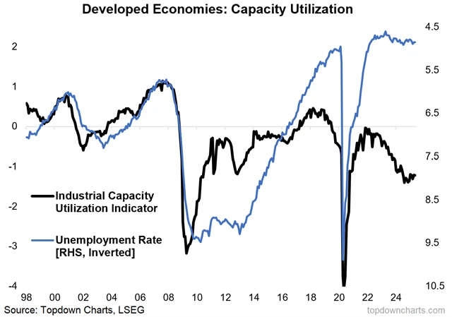 Přiložený graf ukazuje takzvané makroekonomické nůžky. Modrá linka (invertovaná pravá osa y) je míra nezaměstnanosti, černá (levá osa y) ilustruje nevyužité průmyslové kapacity. Otázka je, zda sbližování křivek nakonec bude výsledkem posilování průmyslu, a tedy omezování jeho nevyužitých kapacit, nebo zhoršení situace na trhu práce projevujícího se růstem míry nezaměstnanosti.