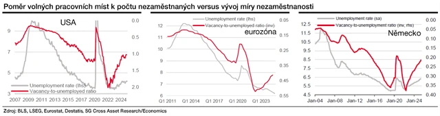 Celková míra nezaměstnanosti zároveň nezachycuje strukturální změny. Zejména v průmyslu pracovní místa zanikají, přičemž dosud to byl do značné míry absorbovat trh služeb, který čelil vysokému odlivu pracovní síly v době pandemie. Proto jsou zajímavější počet vytvořených pracovních míst a poměr počtu volných pracovních míst k celkovému počtu nezaměstnaných. Na této úrovni je pak globálně patrné, že nejvyšší utaženost na trzích práce je prakticky ve všech zemích minulostí.