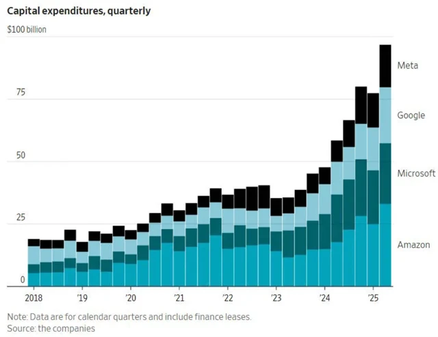Trénování i provoz AI modelů vyžadují obrovský výpočetní výkon. Ten se stal klíčovým faktorem pro udržení technologického náskoku i finančních výsledků. Firmy jako Microsoft, Meta Platforms, Alphabet a Amazon proto masivně investují do nové infrastruktury. Například Microsoft a Meta vynakládají na kapitálové investice přes třetinu svých tržeb.
