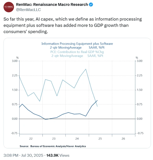 Podle řady komentátorů právě tato vlna investic pomáhá držet americkou ekonomiku nad vodou navzdory obchodním válkám a slabší spotřebě. "Výdaje na AI přispěly v posledních dvou čtvrtletích k růstu hospodářství USA více než celé spotřebitelské výdaje dohromady," říká Neil Dutta, hlavní analytik Renaissance Macro Research.