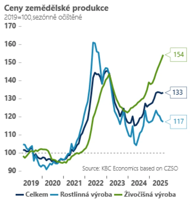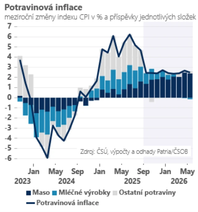 A to všechno samozřejmě není nejlepší zpráva pro spotřebitele. Ceny mléčných výrobků na pultech obchodů už tlaky z výrobních řetězců sice zohlednily a jejich meziroční inflace už dosáhla svého vrcholu. Může ale odeznívat pomaleji, než jsme čekali. U masných výrobků meziroční dynamika dosáhne vrcholu až na jaře 2026 a je velká otázka, jak vysoký ten vrchol ve finále bude. Poslední čísla od zemědělců a potravinářů příliš povzbudivá nejsou.