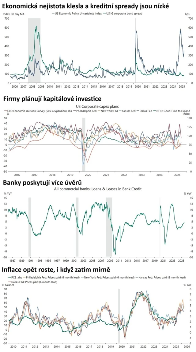 A co je hlavní, regionální průzkumy Fedu a také index ISM pro sektor služeb ukazují na opět o něco zvýšené inflační tlaky. "Ekonomika se vyvíjí lépe, než odpovídá převládajícím odhadům. Atlantský Fed ve svém sledovaném modelu očekává, že americký HDP ve třetím čtvrtletí vzrostl o 3,9 %, což naznačuje, že růst zůstává solidní i přes určité známky oslabení trhu práce. Toto oslabení přitom může být spíše důsledkem nižší imigrace, která omezila nabídku pracovní síly, a také postupného zavádění nástrojů umělé inteligence, jež může snižovat potřebu obsazování některých pracovních pozic," pokračuje Torsten Sløk.