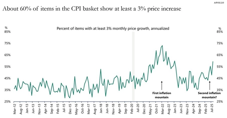 Torsten Sløk, hlavní ekonom společnosti Apollo Global Management, upozorňuje na zvyšující se míru růstu cen v USA napříč spotřebitelským košem. "Zhruba 60 % položek vykazuje meziroční růst cen přes 3 % (na základě anualizovaných měsíčních dat). Napříč americkým spotřebitelským košem tak sledujeme podobnou inflační dynamiku jako při velké inflační vlně v roce 2021. Nelze tak vyloučit něco podobného," varuje.