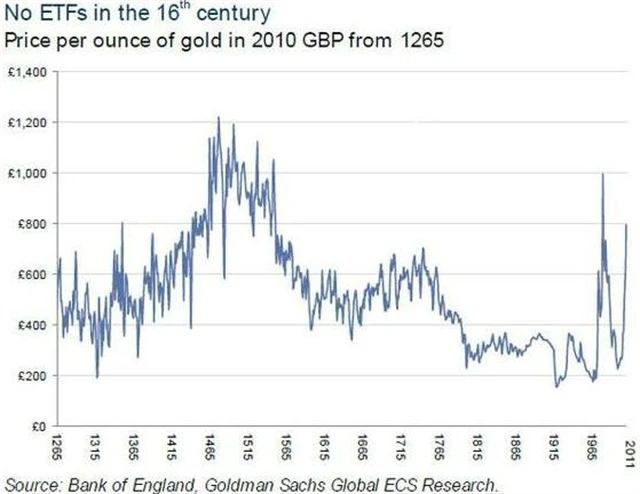 Graf ceny zlata za posledních několik století ukazuje několik zajímavých věcí, mimo jiné dva extrémně rychlé vzestupy v uplynulých dvaceti letech. Zhruba od 16. století ovšem cena zlata průběžně klesala s tím, jak se zvyšovaly zásoby tohoto kovu. Až měnová politika odtržená od zlatého standardu začala dělat ze zlata onu "léty prověřenou oázu bezpečí". Investoři by na tuto souvislost neměli zapomínat.