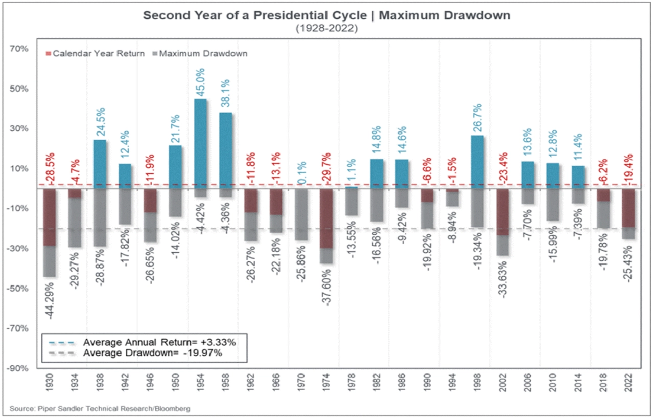 Nemá smysl si představovat, co všechno se může pokazit v ekonomice nebo v politice (vedle geopolitiky investory jistě napadne třeba další případný shutdown). Historie každopádně ukazuje, že právě ve druhých letech prezidentských cyklů je na tom americký akciový trh v průměru nejhůře. Index S&P 500 v průměru přidává asi 3,3 % a maximální pokles dosahuje bezmála 20 %.