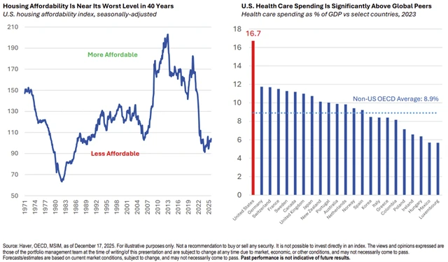 Zdravotní péče je neméně závažný problém. USA vydávají na zdravotnictví 16–17 % HDP, což je skoro dvojnásobek průměru vyspělých zemí. Navzdory tomu domácnosti čelí růstu pojistného a spoluúčastí, případně rovnou přímých úhrad. Inflace v oblasti zdravotní péče zůstává citlivým politickým tématem. Jeho náročnost umocňují složitá administrativa, nízká transparentnost systému a rostoucím význam sítí zdravotnických zařízení vlastněných soukromým kapitálem (pro bohaté a pro investory je to fajn, dostupnost pro běžné Američany je ale minimální).