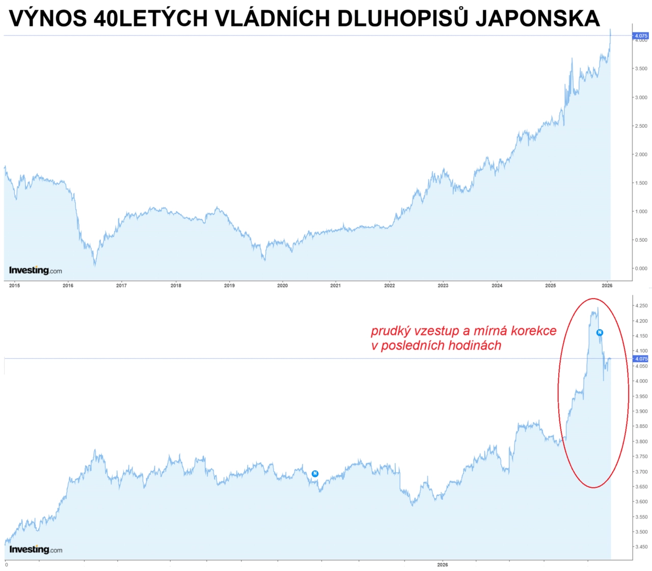 Chaos a fragmentace přitom trhy v současnosti tak úplně "nekoušou". K tomu přispívá i nervozita ohledně fiskální situace. A nejde jen o Spojené státy a udržitelnost jejich dluhu, pozornost si opět vysloužilo také Japonsko. "Kvůli ambiciózním rozpočtovým plánům vlády narostly během posledních dvou dnů výnosy čtyřicetiletého státního dluhopisu o 40 bazických bodů na zhruba 4 %," připomíná Rusinko. Právě Japonsko a jeho minimální sazby přitom po dekády fungovaly jako zdroj levné likvidity na globálních trzích.