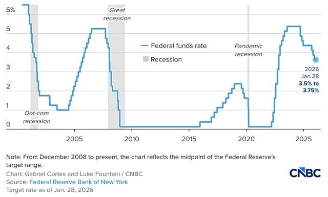 Měnový výbor americké centrální banky v lednu podle očekávání ponechal základní úrokovou sazbu v pásmu 3,5–3,75 %. Přerušil tak sérii tří předchozích snížení o čtvrt procentního bodu. Rozhodnutí bylo v souladu s očekáváním trhů a znamená přechod k opatrnějšímu, vyčkávacímu přístupu k měnové politice v roce, kdy do čela banky nastoupí nový předseda.