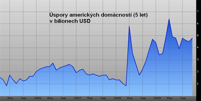 Úspory amerických domácností jsou dnes čtyřnásobné ve srovnání s rokem 2008. A z průzkumů vyplývá, že lidé chtějí šetřit dál. Polovina dotázaných přestala investovat na kapitálových trzích, většina nezamýšlí investovat další 3 roky a 43 procent Američanů nevěří, že se ekonomika vrátí na předkrizovou úroveň.