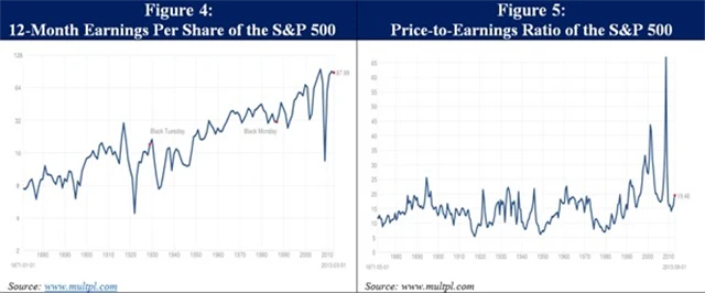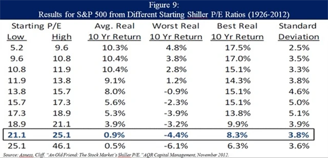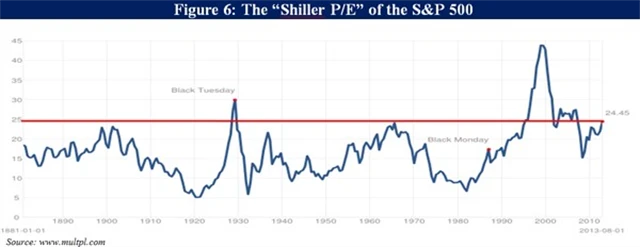 Známý investor a pesimista John Hussman se snaží zasadit současné valuace do historického kontextu: "Shillerovo P/E je nyní 24,4 – na podobné úrovni jako v srpnu 1929 a výše než v prosinci 1972 i než v srpnu 1987, zato ale méně než v březnu 2000. Shillerovo P/E je současně mírně pod úrovní 27, tedy vrcholu v říjnu 2007."