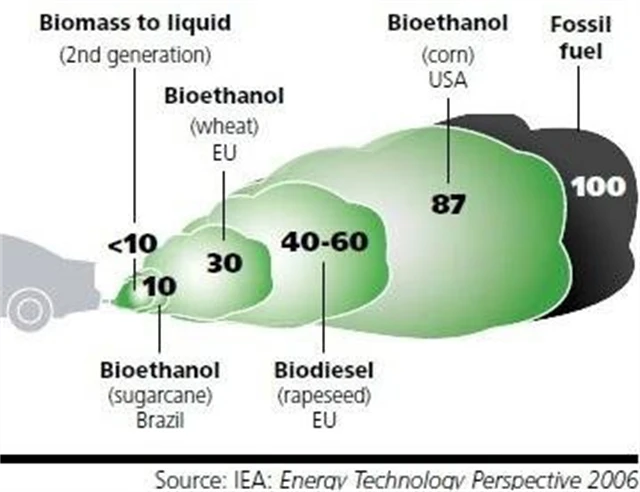 Druhý graf zobrazuje, jakou redukci oxidu uhličitého použití biopaliv v dopravě nabízí. Pařížská Mezinárodní energetická agentura (IEA) jasně ukazuje efekt první a druhé generace biopaliv na emise oxidu uhličitého ve srovnání se základnou 100, která vyjadřuje emise klasických fosilních paliv, jako je benzín.