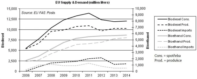 V EU je hlavním biopalivem v dopravě biodiesel (podíl zhruba 70 %), zbytek připadá na ethanol, který je naopak jedničkou v USA. Produkce v EU není na úrovni, která by uspokojovala rostoucí poptávku, zhruba 20 % se musí dovážet.