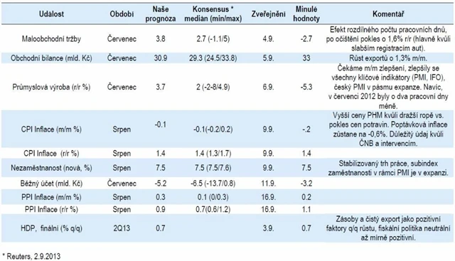 V prvním zářijovém týdnu bude nadále hrát významnou roli potenciální vojenská intervence v Sýrii. Nervozita s koncem týdne klesala poté, co britský parlament vojenskou akci nepovolil, avšak nadále je pravděpodobné, že Spojené státy k zásahu přistoupí. "Domníváme se, že takový krok by na trhy vrátil nervozitu vzhledem k možné destabilizaci celého regionu a obav z reakce Íránu. Na následující týden proto máme spíše negativní výhled," upozorňuje Sklenář.