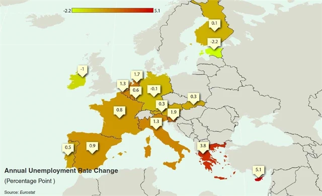 Indexy nákupních manažerů tento týden naznačily, že se evropská ekonomika dostává z nejhoršího. Mapa z dílny Bloomberg Briefs ovšem ukazuje starý kontinent v mnohém méně příjemném světle, a sice trhu práce. Až na pár světlých výjimek (Německo, Estonsko, Irsko) za poslední rok míra nezaměstnanosti vzrostla ve všech zemích eurozóny. A rostoucí nezaměstnanost znamená všechno možné, jen ne příslib udržitelného ekonomického oživení.
