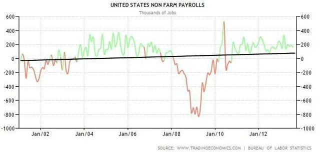 Finanční a dluhová krize eskalující v roce 2008 způsobila na trhu práce obrovské škody, které se i při současných nárůstech počtu pozic jen velice pomalu napravují. Ačkoli by byl jistě americkým politikům i bankéřům spíše po chuti výraznější růst, kvantitativní uvolňování (QE) nemůže pokračovat navěky. Obrovská peněžní zásoba je z důvodu nízké rychlosti peněz sice inflačně málo nebezpečná, ale v jistém okamžiku musí dojít k jejímu přelití do reálné ekonomiky. V podstatě nikdo neví, co může udělat s růstem cenové hladiny.