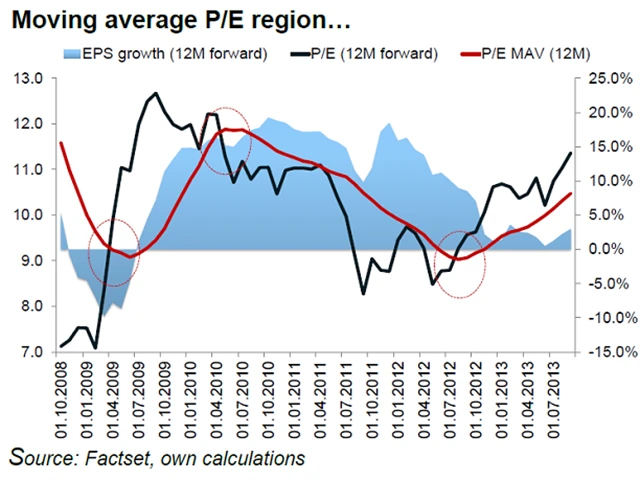 Konsensuální odhady zisků ukazují jen velmi opatrné zlepšení a nadále žádné výraznější momentum ve vývoji. Ocenění ve vztahu k růstu nadále kreslí spíše křehký obrázek. Ukazatel P/E regionu na 11,4 je zhruba 5 % pod historickým průměrem, a proto neznamená výraznější argument pro ani proti trhu.
