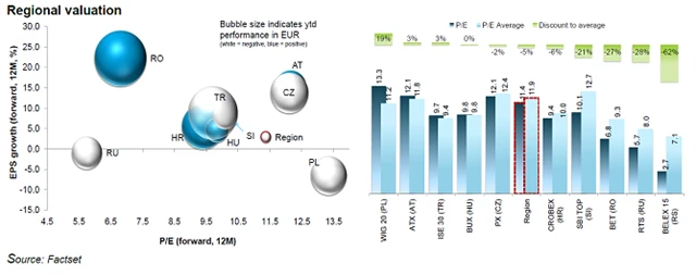 Naopak mírně podvážit doporučujeme celý region jihovýchodní Evropy. Ocenění srbského trhu je stále akceptovatelné, ačkoli kvalita tržního konsensu může být poměrně slabá, ale chorvatský CROBEX není úplně levně oceněn s ročním P/E na úrovni 9,4 (jen 6 % pod historickým průměrem). Pro chorvatský trh tak platí spíše opatrný pohled, zejména při porovnání očekávaného růstu a ocenění (PEG na úrovni 1,7). Oba trhy měly podporu vstupem do EU nebo kandidaturou, což ale v současném prostředí opět poněkud vyšší averze k riziku by mohlo přestat platit.