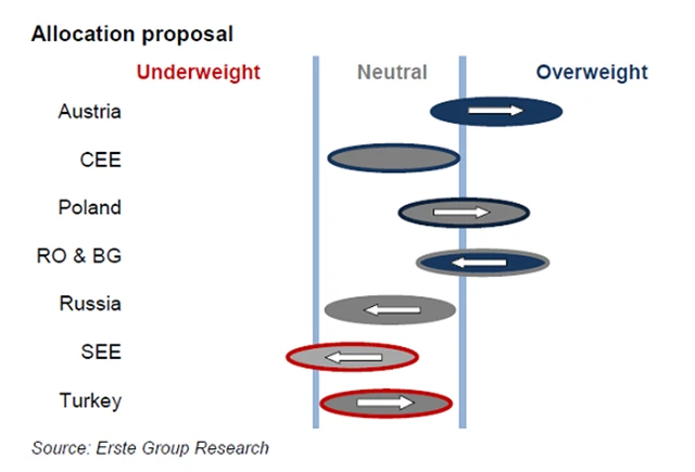Rakouské tituly vzhledem k tomu, že Rakousko má možnost zachytit jak oživení eurozóny, tak oživení ve střední a východní Evropě, doporučuje Erste mírně nadvážit. Index rakouské burzy se poslední dobou vyvíjel dobře, takže je vidět určité zpomalení růstu, což dokládá i očekávání trhu na základě posledního průzkumu ZEW. "Na žádný titul nemáme vysloveně doporučení KUPOVAT, ale je zde několik zajímavých titulů s doporučením AKUMULOVAT, které by měly táhnout celý trh výše. Ani nedávné volby by neměly trh poškodit vzhledem k tomu, že je pokračování velké koalice nejpravděpodobnějším vyústěním," píší analytici z Erste Group Bank.