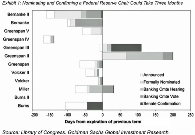 Na grafu je vývoj jmenování předchozích šéfů Fedu - kdy byla jejich nominace oznámena, kdyby byli oficiálně nominováni, průběh hlasování bankovního výboru Senátu a celého Senátu a jak dlouho to všechno trvalo, než dotyčnému vypršelo funkční období. Bernankeho druhé funkční období bylo oznámeno téměř pět měsíců před vypršením toho předchozího. Přesto další fáze procesu trvaly několik měsíců a až pár dní před oficiálním koncem jeho prvního období jmenování odklepl i Senát.