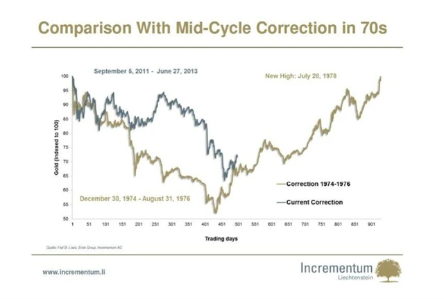 Je to také důvod, proč držíme zlato. Je to měna, kterou Fed ani nikdo jiný nemůže tisknout. Na téma zlata napsal skvělý článek Ronald Stöferle z poradenské společnosti Incrementum. Ve srovnání s korekcí zlata v letech 1974 až 1976 není současný pokles cen nic nového. Otázkou je to, zda jsou ekonomické podmínky lepší než v 70. letech. Budeme předpokládat, že zadlužení je v současnosti objektivně horší.