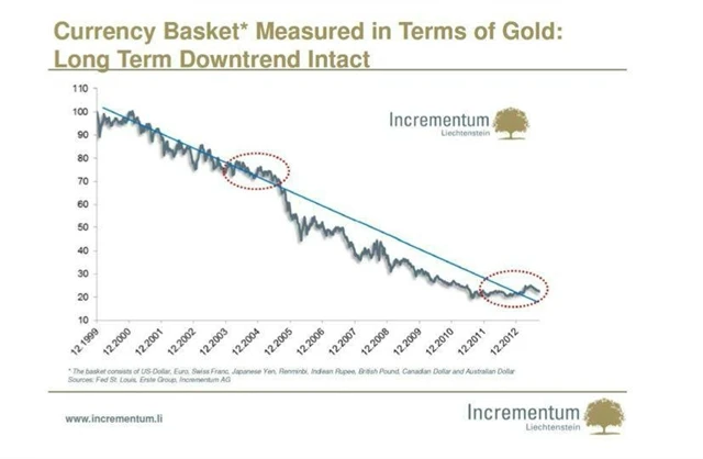 Abychom se dostali k podstatě - má smysl vlastnit zlato, protože tištění peněz světovým měnám škodí. Dlouhodobý pokles světových měn vyjádřený v cenách zlata stále pokračuje.