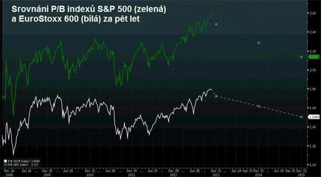 "Ukazatel P/B evropských akcií ve srovnání s P/B amerických akcií je na nejnižších úrovních od roku 1975. Do konce roku 2014 by se tak index DJ EuroStoxx 600 měl dostat na 400 bodů, tedy na hodnoty z roku 2007," píše banka.