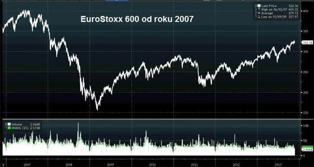 Zatímco americké akcie překonávají rekordy, evropské k nim mají ještě daleko (s výjimkou těch německých a britských, francouzský CAC 40 naopak výrazně zaostává za předchozími vrcholy). DJ EuroStoxx 600 je stále více než 40 % pod svým historickým maximem.