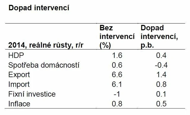 Navíc je evidentní, že koruna nezůstane takto slabá navěky. V případě větších nákupů (auto, elektronika) však můžou lidé i firmy sázet na to, že poté, co ČNB z trhu odejde, koruna skokově posílí. Dle nás tak čistý efekt na spotřebu domácností kvůli intervenci bude v roce 2014 negativní, a to ve výši zhruba 0,3 až 0,4 procentního bodu. V roce 2015 začne být lehce pozitivní díky snížení míry nezaměstnanosti.