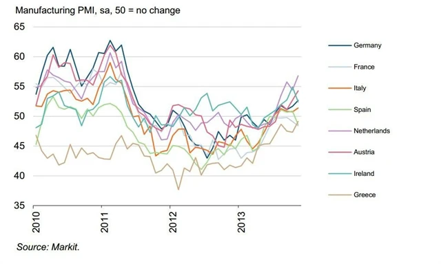 Index nákupních manažerů v Nizozemsku vykázal nejlepší výsledek za posledních 31 měsíců, na 30měsíční maximum se vyšplhaly i Rakousko a Itálie a 29měsíční maximum zaznamenalo Německo. Nejvíce si polepšilo Řecko, které se sice stále nachází pod padesátibodovou hranicí, index však zaznamenal nejlepší výsledek za 51 měsíců (49,2 bodu). Francie naopak spadla na 5měsíční minimum (48,4 bodu), přestože výsledek nebyl tak špatný, jak předvídala předběžná data, a Španělsko spadlo zpět pod 50 bodů na půlroční minimum 48,6 bodu. Tříměsíční minimum zaznamenalo Irsko (52,4 bodu), jeho zpracovatelský sektor však stále expanduje, byť mírnějším tempem.