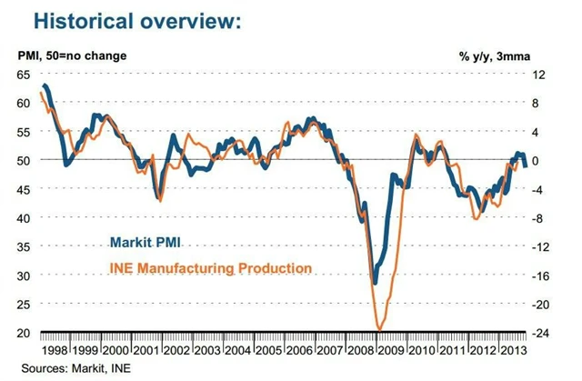 Index nákupních manažerů ve Španělsku se v listopadu propadl zpět pod padesátibodovou hranici dělící expanzi od kontrakce. Hodnota index byla nejnižší od května letošního roku a dosáhla pouze 48,6 bodu po říjnových 50,9 bodu. Obnovil se propad v oblasti produkce sektoru a nových firem v odvětví a zaměstnanost dále klesá.