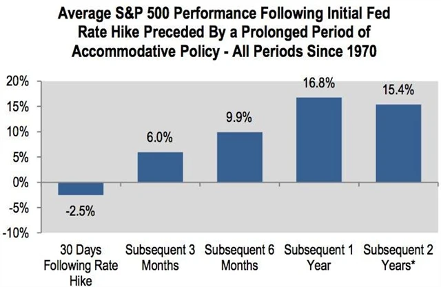 A zatřetí, ještě dlouho - podle současných odhadů zhruba dva roky - budou sazby Fedu na minimu. Totéž mimochodem platí o ECB. No a nízké sazby jsou rovněž nástroj na podporu ekonomiky, běžně jeden z těch silných. Nežijeme sice v běžné době, šermuje se s termíny jako "nový normál", ale teprve až porostou sazby, bude možné mluvit o zpřísňování měnové politiky. A ani to v dlouhodobějším horizontu nebývá pro americké akcie nepříznivé, jak ukazuje graf, který před pár dny v jedné ze svých poznámek k dění na trzích použil Brian Belski z BMO Capital Markets. Podle něj by se dokonce investoři měli těšit na první zvýšení základní úrokové sazby, kromě prvního měsíce se totiž následně americkým akciím tradičně daří.