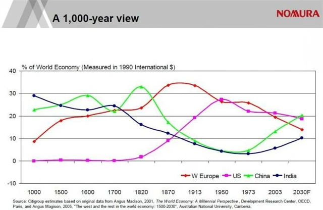 Největší ekonomikou světa jsou aktuálně Spojené státy. Čína a Indie ale v posledních desítkách let zahájily spanilou stíhací jízdu. Někdejší hegemon, jímž byla západní Evropa s mocnostmi jako Francie, Anglie, Německo a dalšími, se naopak propadá.