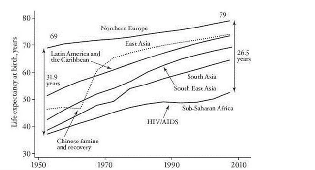 Jestliže dolary prozrazují jen část pravdy o pokroku, čeho jiného si všímat? Třeba toho, jak dlouho lidé žijí. Všude na světě déle než před půl stoletím. "Děti v subsaharské Africe mají větší šanci dožít se pátých narozenin než děti narozené v roce 1918 v Anglii. Indové mají při narození naději na delší život než Skoti v roce 1945." Rozdíl mezi očekávaným věkem dožití v bohatých a chudých částech světa se vytrvale snižuje, ačkoli by to, pravda, mohlo jít rychleji.