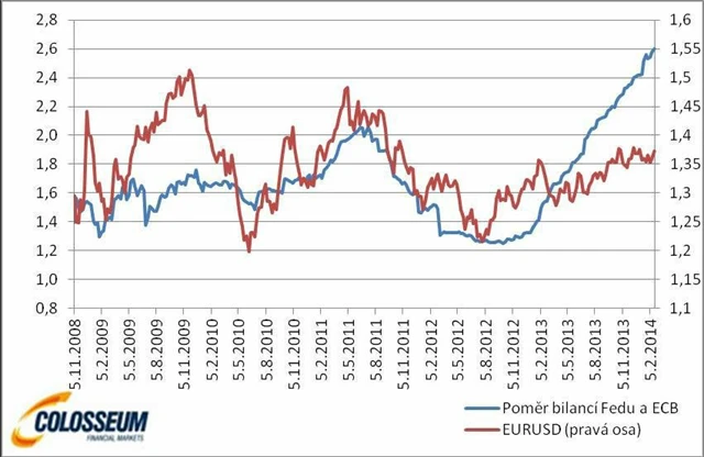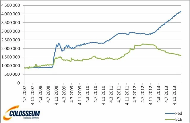 Obě centrální banky výrazně nafoukly bilance v reakci na propuknutí krize v roce 2008. Cílem bylo nalít likviditu do bankovního sektoru, která se z trhů vytratila v důsledku strachu po pádu Lehman Brothers a dalších finančních institucí. V srpnu 2012 přišel zlom, během kterého ECB navzdory svým deklaracím začala provádět relativně restriktivní měnovou politiku. Fed na druhou stranu v září vyhlásil již třetí kolo kvantitativního uvolňování, které dostalo přezdívku "kvantitativní uvolňování nekonečno". Dle našeho názoru je toto jeden z hlavních důvodů pro pokračování oslabování dolaru a posilování eura.