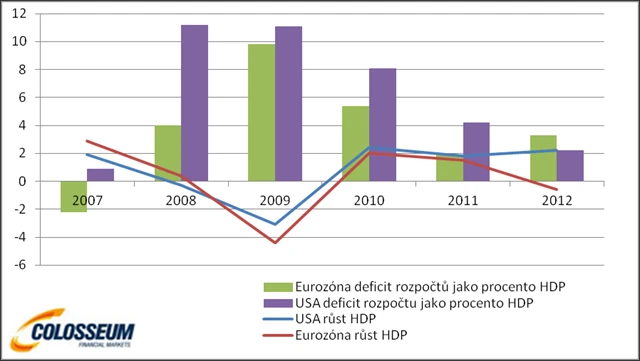 USA a eurozóna procházejí od roku 2008 výraznou finanční a dluhovou krizí. Nárůst dluhů v obou regionech je dramatický, přesto je na tom eurozóna, alespoň z pohledu růstu dluhu i celkového objemu zadlužení, lépe než USA. Fed i Evropská centrální banka řešily krizi maximálním rozvolněním měnové politiky. Zatímco obě banky nadále drží extrémně nízké úrokové míry a dle svých představitelů se je nechystají zvyšovat, jejich přístup k dalším měnovým nástrojům se začal v polovině roku 2012 značně lišit. V horizontu 3 až 6 měsíců očekáváme zdražení eura ze současných 1,37 na 1,45 EUR/USD.