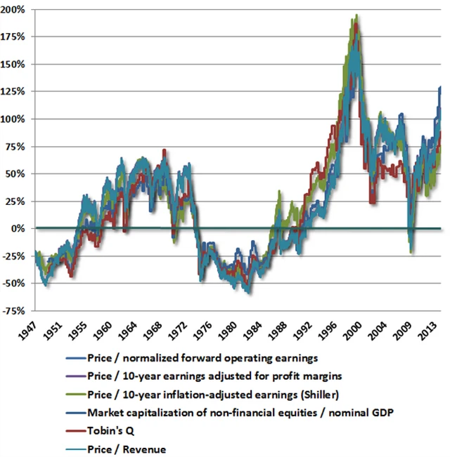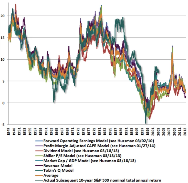 Podle indikátorů ocenění, které historicky vykazují téměř 90% korelaci s výnosy z S&P 500 v následujících deseti letech, známý manažer a investor John Hussman odhaduje, že jsou ceny amerických akcií aktuálně více než dvakrát dražší, než by odpovídalo historicky běžným budoucím výnosům.