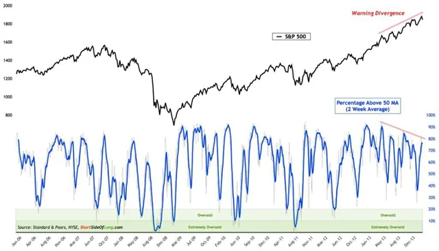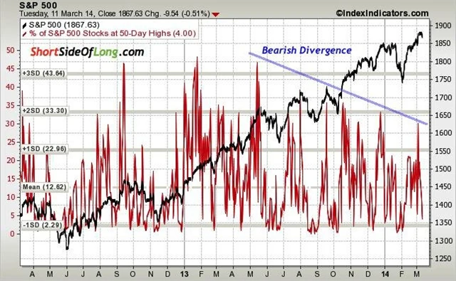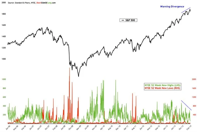 Podle statistik Newyorské burzy rychle ubývá firem, jejichž akcie překonávají svá roční maxima. Během říjnového růstu indexu dosáhlo na 52týdenní maximum 471 akcií, při prosincovém růstu to bylo už jen 361 titulů, při růstu na rekordy v minulých týdnech to bylo 301 firem. Tento trend může vést k propadu trhu, až místo počtu maxim poroste počet rekordně nízkých hodnot. Ten sice zatím neroste, ale investoři by měli tento ukazatel pozorně sledovat.