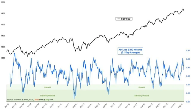 Když se podíváme na graf, který ukazuje poměr rostoucích a klesajících akcií, vidíme, že tento poměr je nejvyšší od března 2013. To může být také varovný signál.