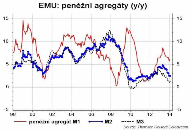 Z grafu je patrný propad tempa růstu širších peněžních agregátů (M2 a M3) po pádu Lehman Brothers, který byl částečně zmírněn akcemi ECB na dodání likvidity v průběhu dluhové krize. V současnosti opět rychlost růstu M3 klesá a je nyní zřetelně pod hodnotou cílovanou ECB (4,5 %).