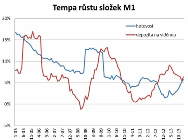 Prudké výkyvy úzkého peněžního agregátu M1 (hotovost, vklady na viděnou) souvisí se změnami preference likvidity v průběhu krize a s poklesem sazeb z krátkodobých vkladů na peněžním trhu k nule.
