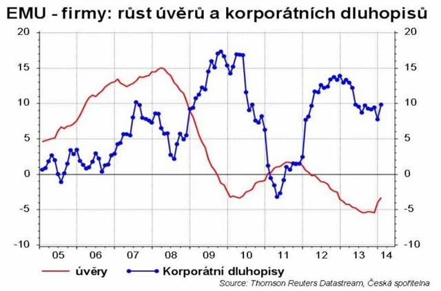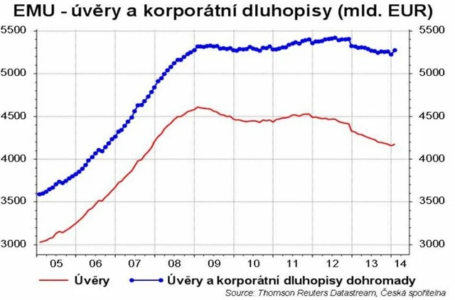 Samotný objem úvěrů v posledních letech klesl a se započtením dluhopisů zhruba stagnoval. Proti období před krizí, kdy objem úvěrů dynamicky rostl, je však situace v posledních letech zřetelně horší.